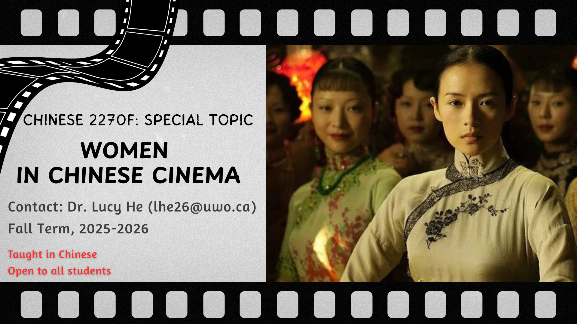 | CHN 2270F – Special Topics: Women in Chinese Cinema | He | 550 |