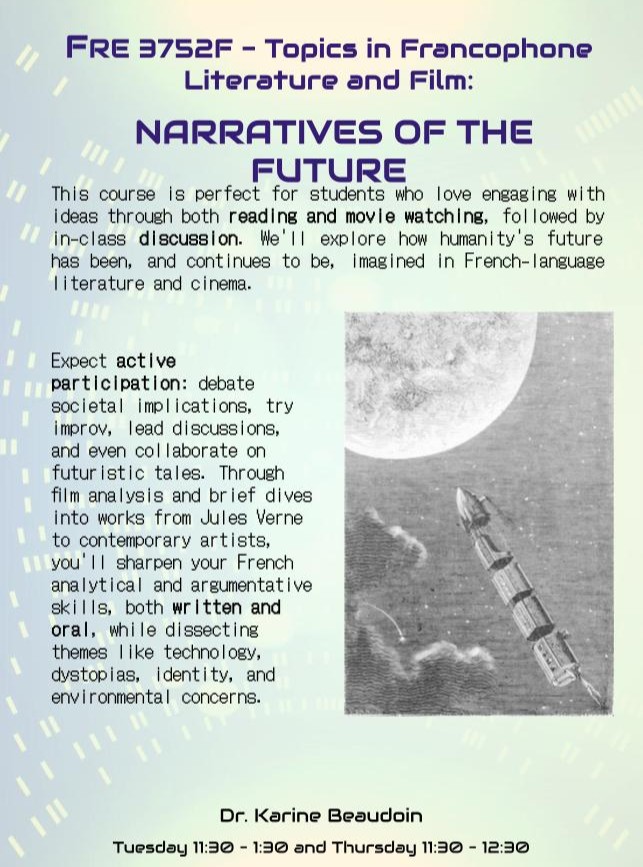 | FRE 3752F – Topics in Francophone Literature and Film: Narratives of the Future | Beaudoin | 550 |