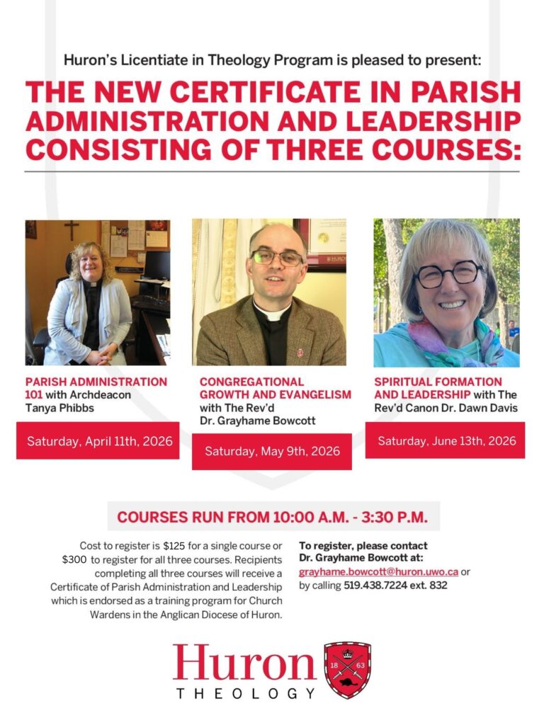 The Rev. Canon Dr. Grayhame Bowcott, or “Gray” as he is known by his students, serves in a cross appointment as a parish priest in the Diocese of Huron and as our Program Director for Huron University College’s Licentiate in Theology Program. He also has been appointed by the Bishop of Huron as a Canon Catechist (or Teacher) in support of lay leaders and clergy throughout the congregations in the Diocese of Huron. Gray is passionate about enabling vocational leaders in the local church and helping students to access theological education, even in remote areas. This focus has inspired him to seek out new relationships between students, lay leaders, bishops, dioceses and other theological institutions in order to shape the network of courses that the Licentiate Program has blossomed into. Gray is always willing to take a call to answer questions or to explore ministry possibilities with his students. If you are discerning your own vocational call and are considering theological education, don’t hesitate to connect with Gray – it may be the first step on your journey of learning.