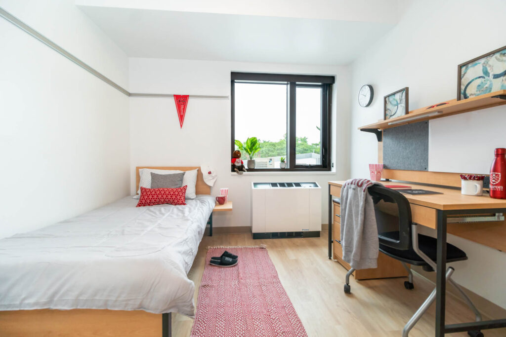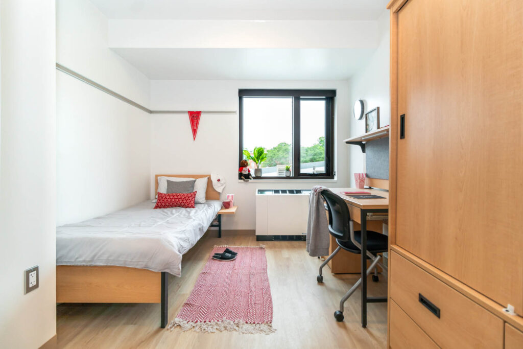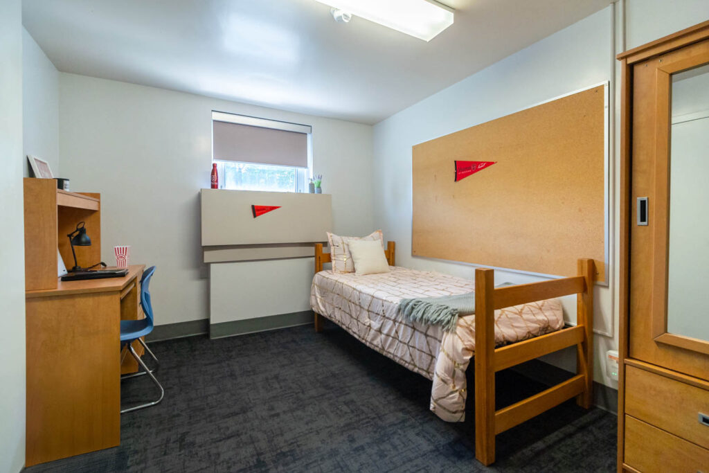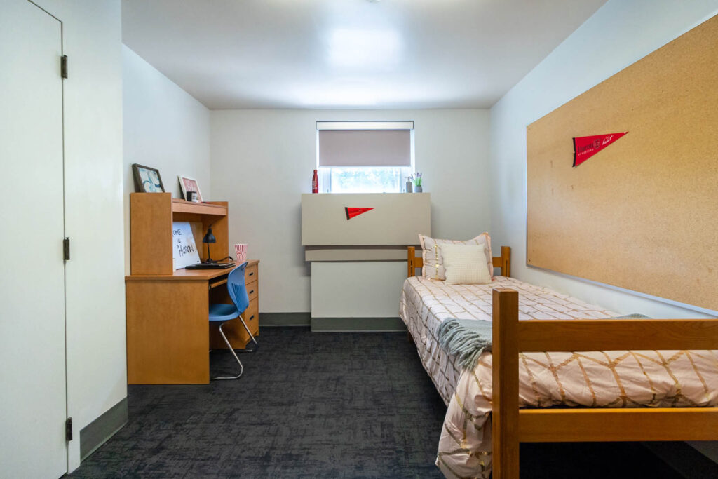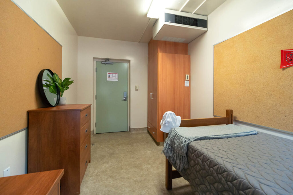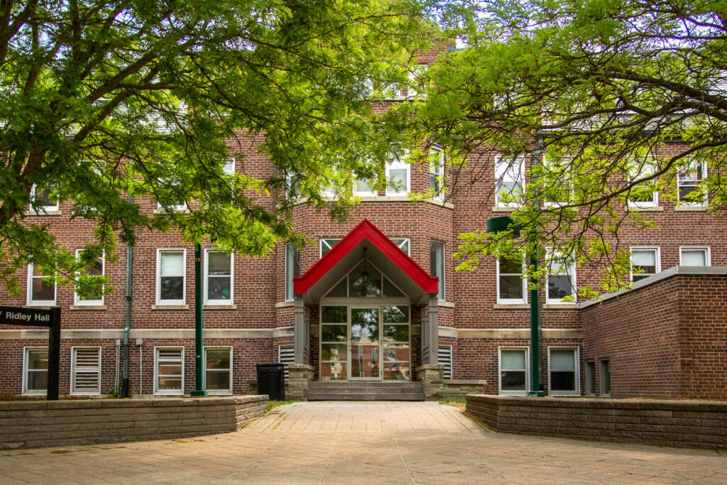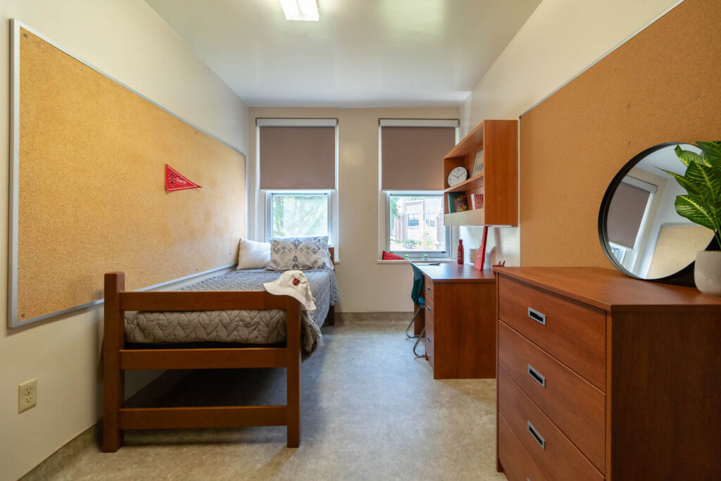 O’Neil/Ridley is made up of three floors, two wings per floor, and consists of single rooms, single ‘pods’ and double bedrooms (some with traditional beds and some with loft beds). Students may wish to live in a “pod”, which is a cluster of single rooms with a shared washroom (between 4-7 students in each pod), accessible only to those students located in the pod area. Shared gender-specific washrooms are located on each floor in each wing, with a number of single gender-neutral washrooms also available for use.
